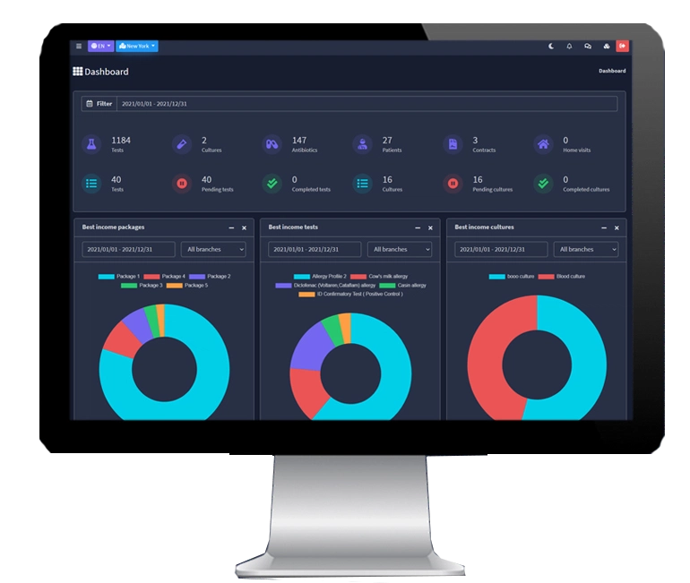 A comprehensive dashboard Laboratory statistics, Useful statistical graphs,monitoring online users and patients, view today scheduled home visits.
